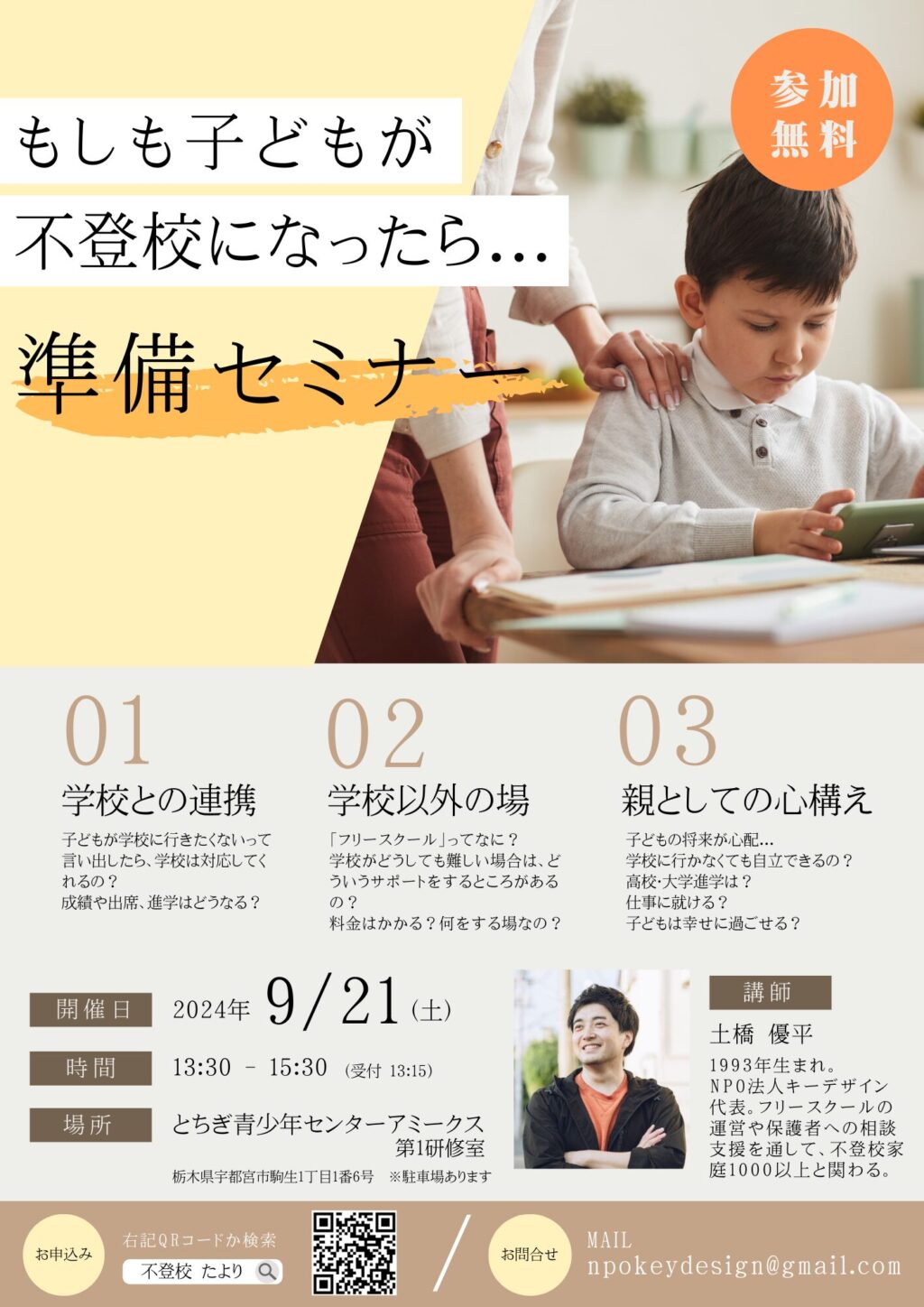 ※今回の場の、メイン対象は「子どもが不登校、行き渋りをしていない保護者」となります。すでに子どもが不登校、行き渋り状態になっている方でもご参加いただけますが、講演の内容は上記のメイン対象にあわせた内容になっておりますことをご承知ください。質疑応答の場もありますのでご相談も可能です。