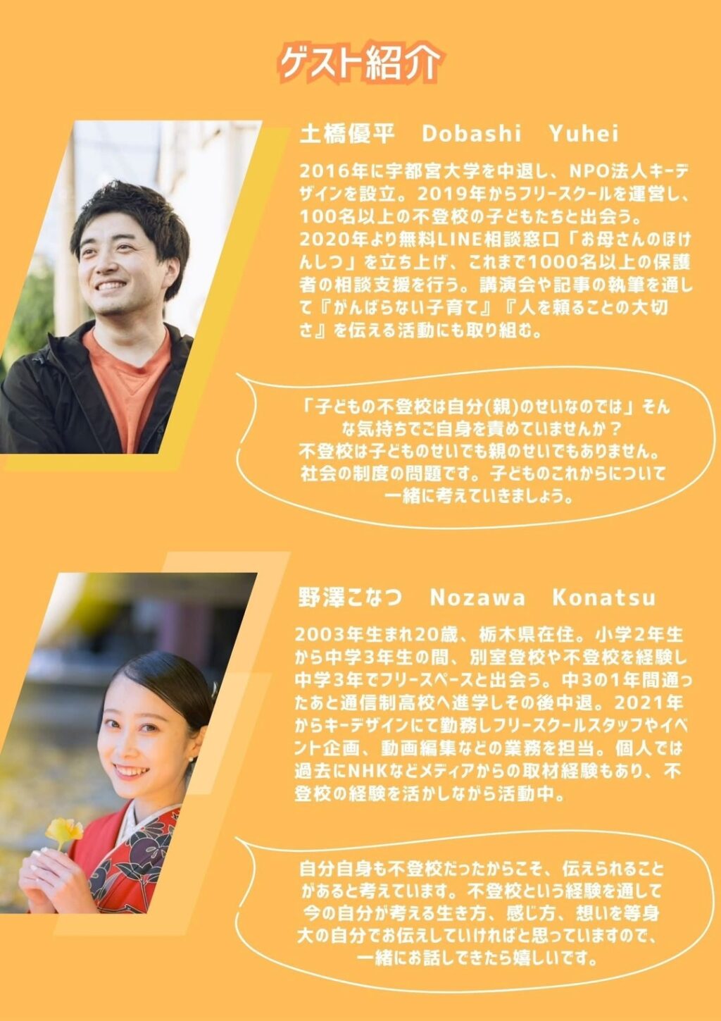 2003年生まれ20歳、栃木県在住。小学2年生から中学3年生の間、別室登校や不登校を経験し中学3年でフリースペースと出会う。中3の1年間通ったあと通信制高校へ進学しその後中退。2021年からキーデザインにて勤務しフリースクールスタッフやイベント企画、動画編集などの業務を担当。個人では過去にNHKなどメディアからの取材経験もあり、不登校の経験を活かしながら活動中。