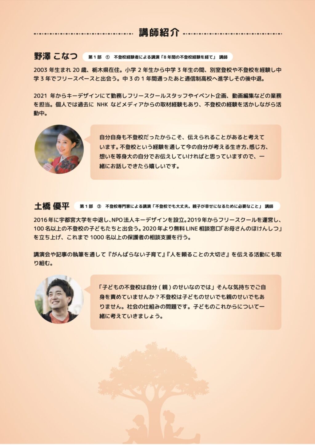 第一部では2名の講師を迎え、「8年間の不登校経験談」や「親子が幸せになるために必要なこと」などの話を聞く事ができます。