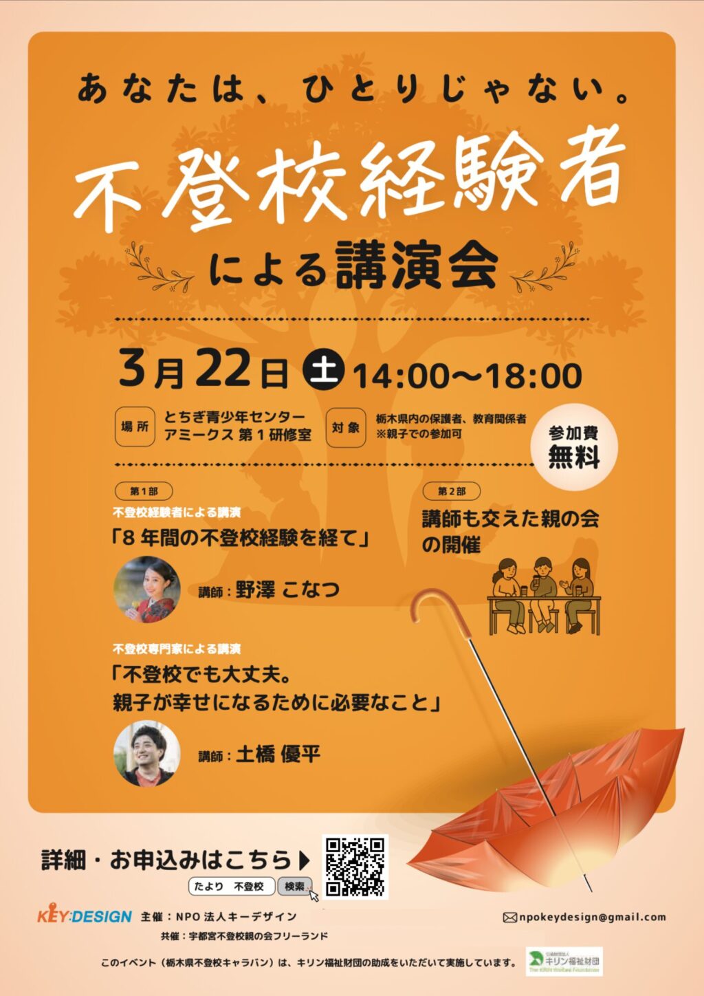 ※この講演会(栃木不登校キャラバン)は、キリン福祉財団の助成をいただいて実施しております。