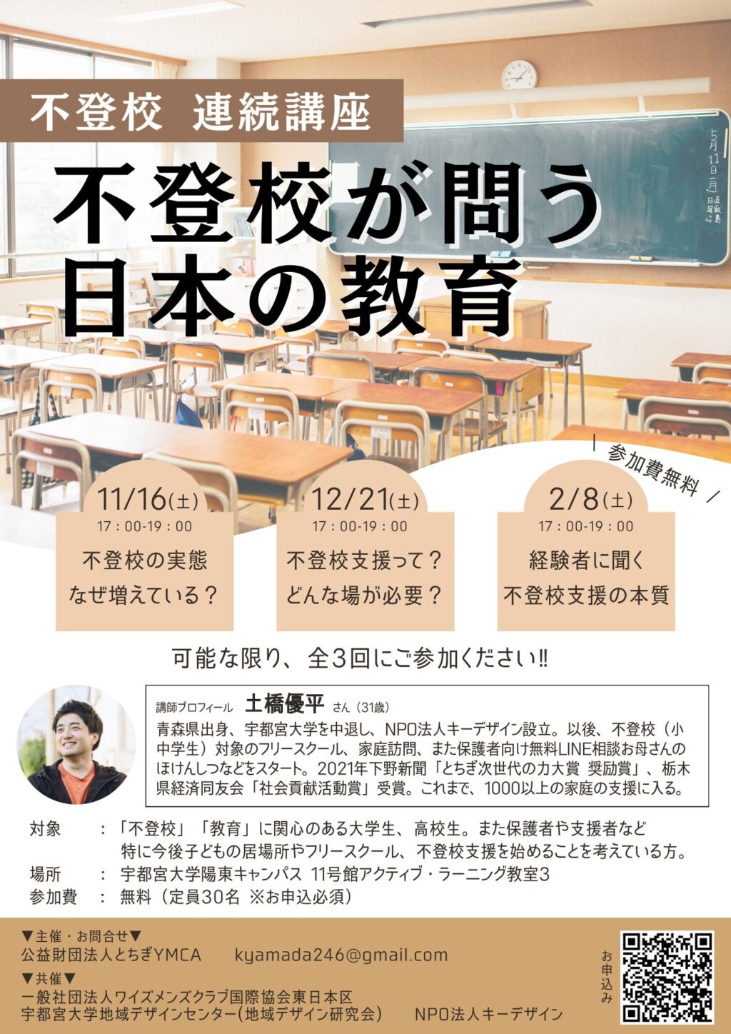 NPO法人キーデザイン代表の土橋優平さんが講師として登壇され、全3回に分けて、不登校についての講座を行います。