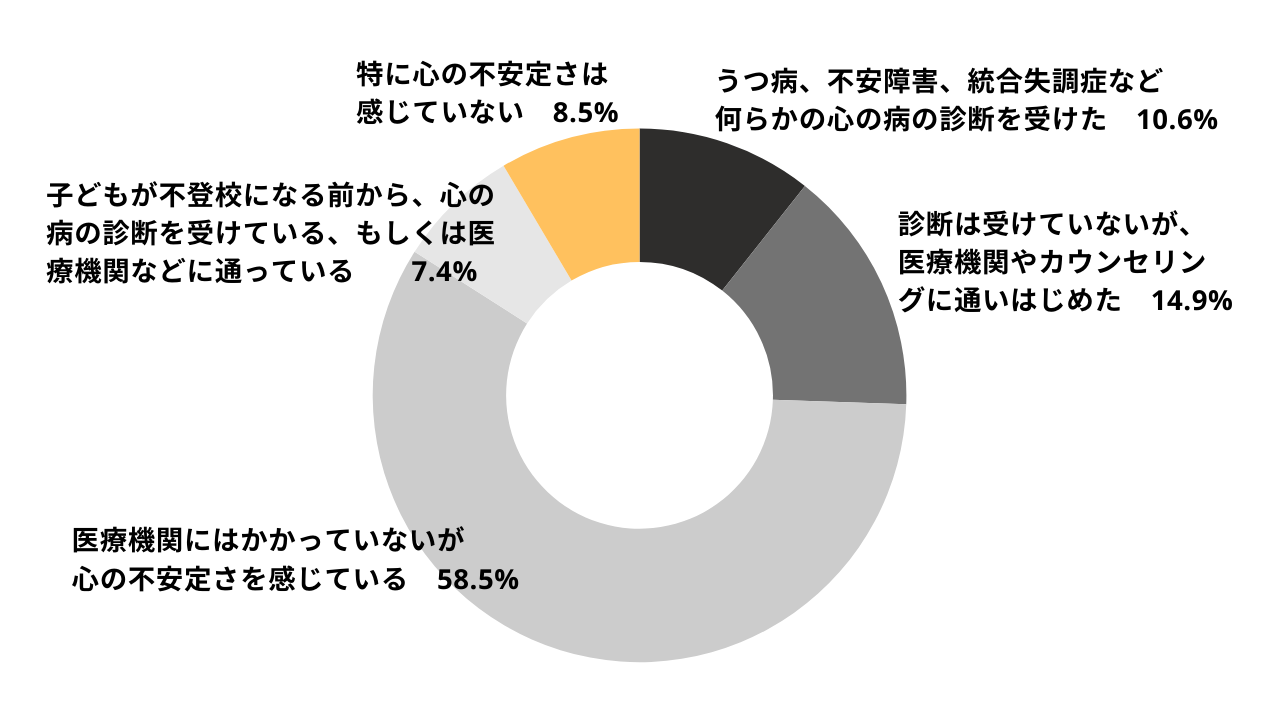「特に心の不安定さは感じていない」8.5%を除くと、91.5%が何らかの心の不安定さを感じていることがわかります。1割の保護者がうつ病などの診断を受けており、2割を超える保護者が医療機関を利用しています。