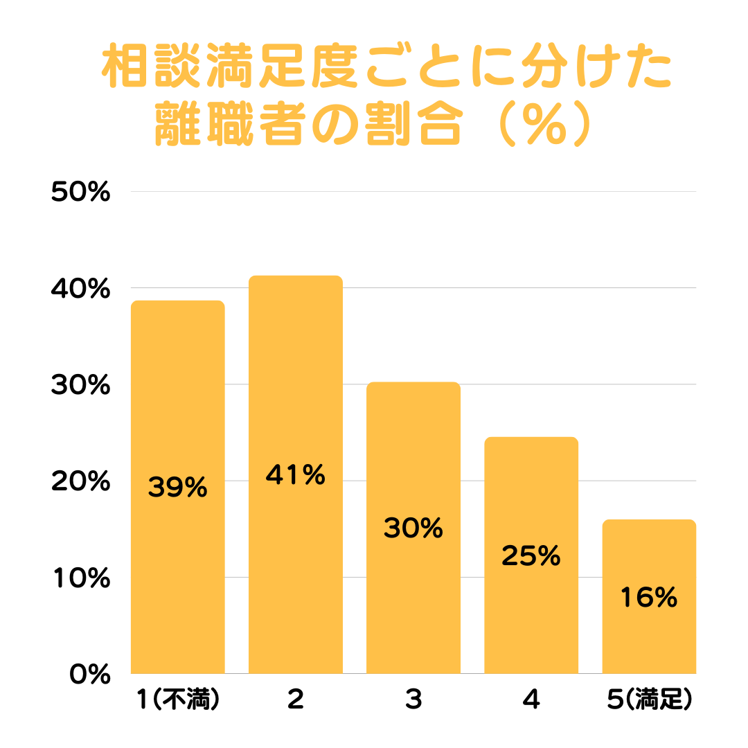 こちらのグラフは「社内での相談の満足度(5段階評価)」と離職者の割合の結果をクロス集計したものです。低い満足度「1」「2」では離職率40.26%なのに対し、高い満足度「4」「5」では離職率21.95%となっており、相談満足度が高ければ高いほど離職率は低いということがわかります。