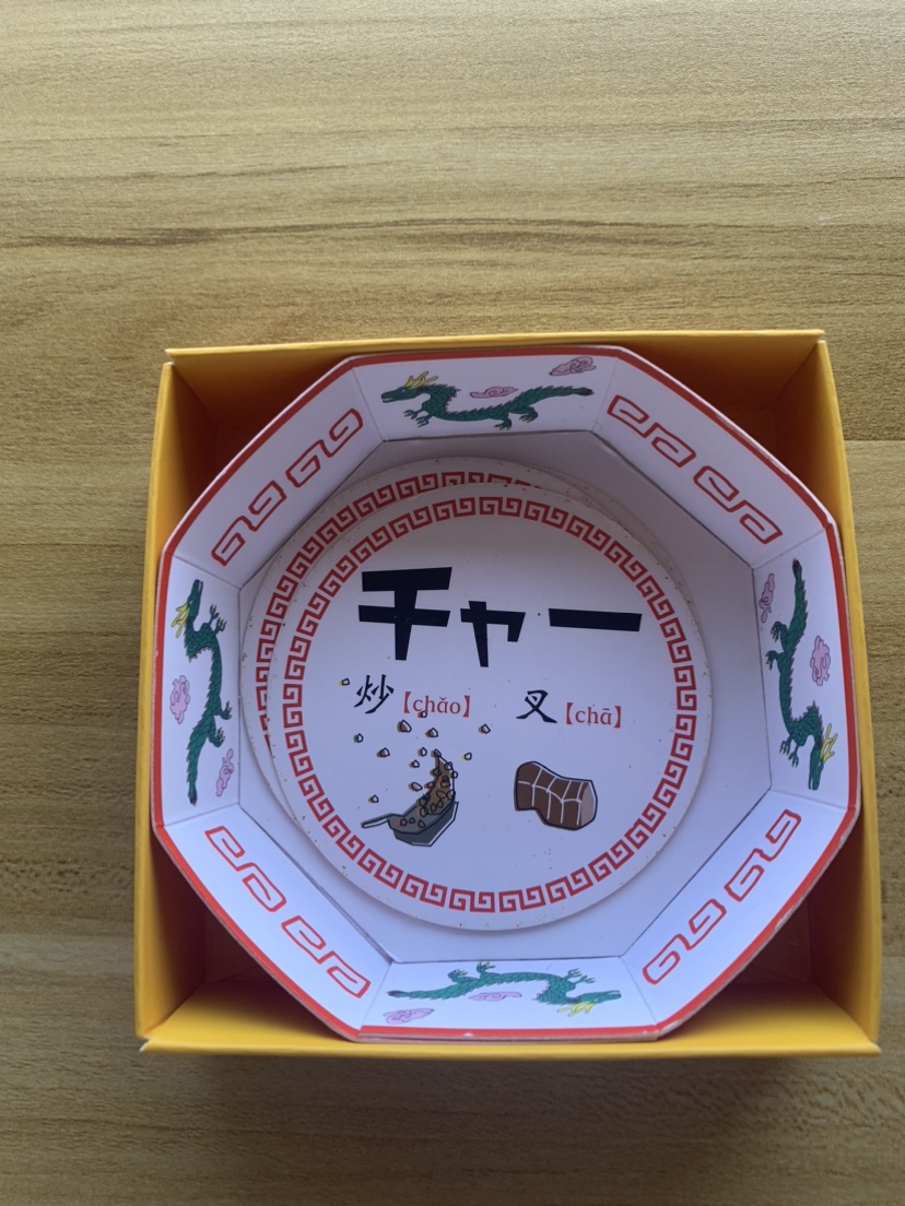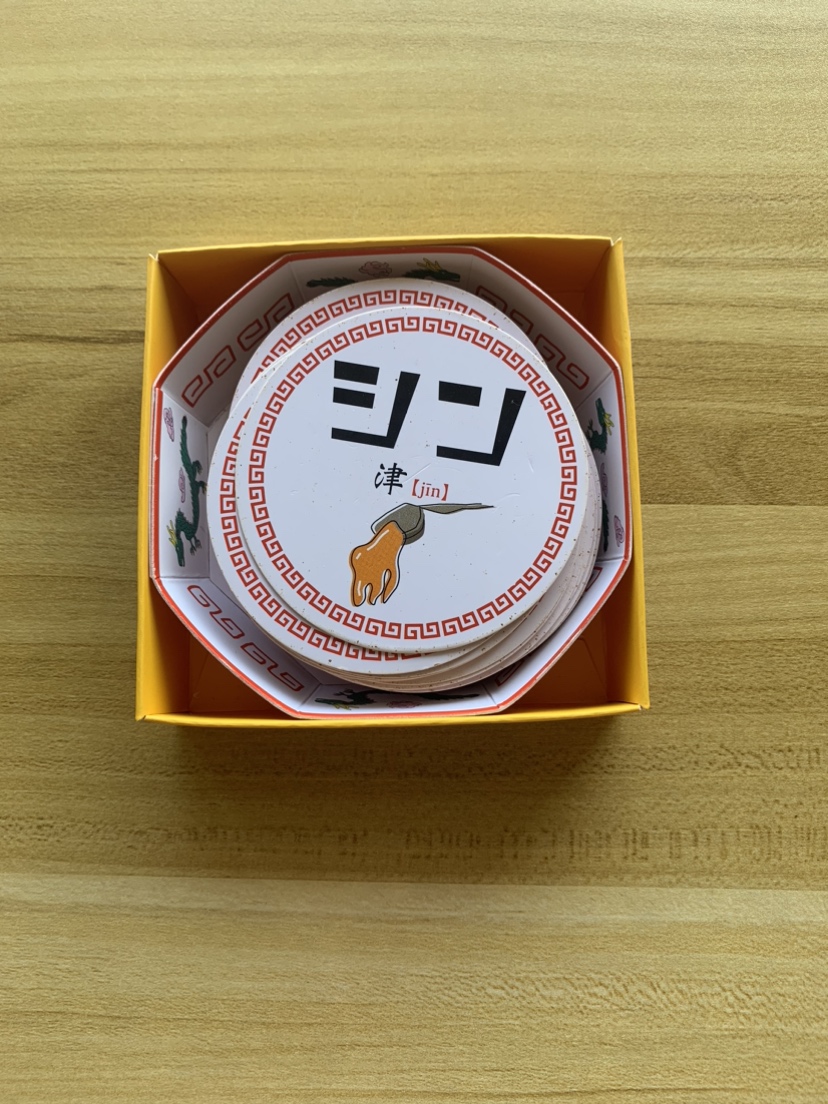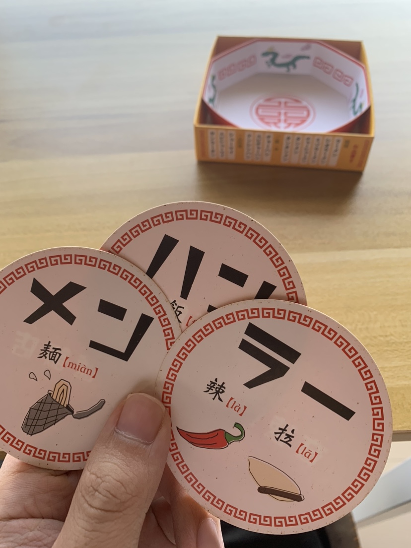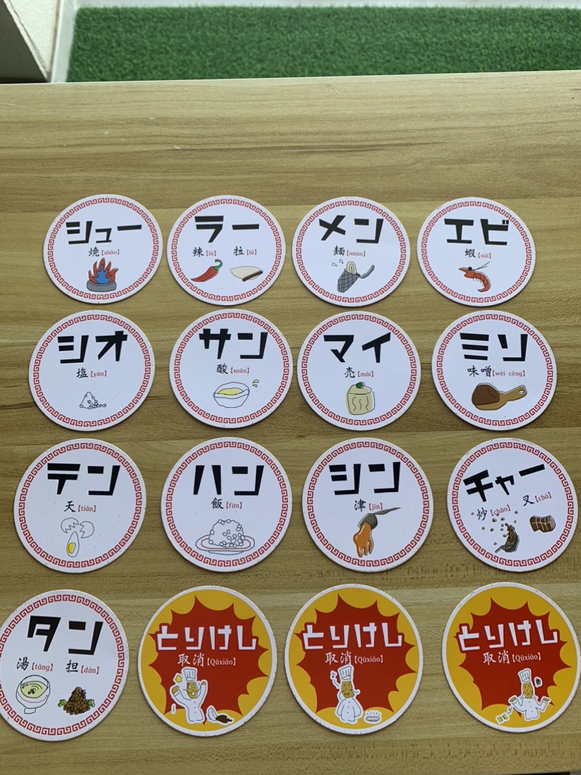 中華料理の名前を作るゲームなのでいきなり、「メン」や「ハン」を出すことができません。下の写真の場合、「ラー」なら出して可能です。(出す時はそのカードの名前を言いながら出すこと。)