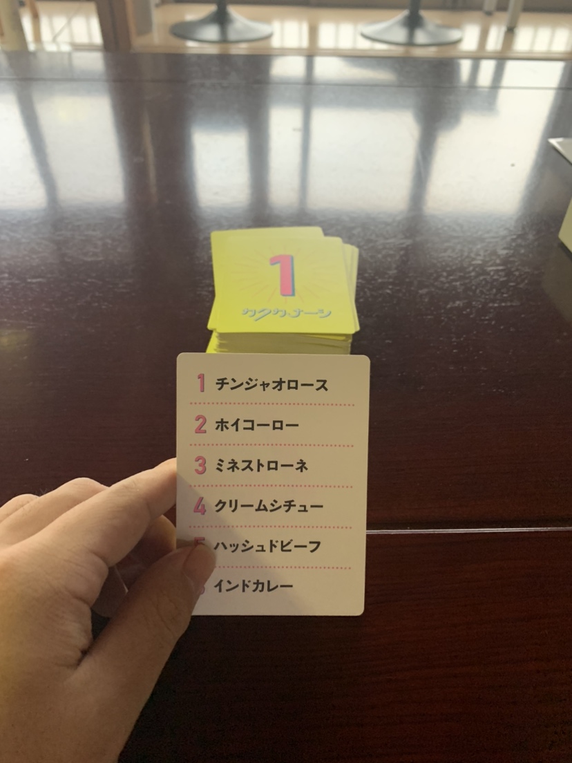 この場合は、山札の上のカードの番号が”1”なので、チンジャオロースがお題になります。