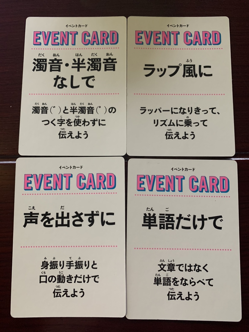 イベントカードは、引いた場合、普通にお題を説明するのではなく、上のような条件に従って説明することになります。