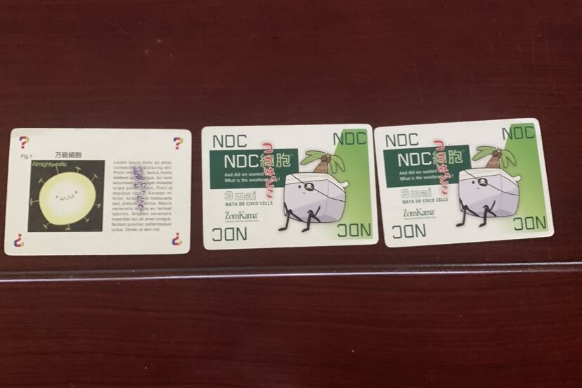 万能細胞・・・トランプのジョーカーみたいなもので、例えば、下のように細胞カード2枚、万能細胞1枚でも揃ったことにできます。(細胞カード1枚、万能細胞2枚でも可)